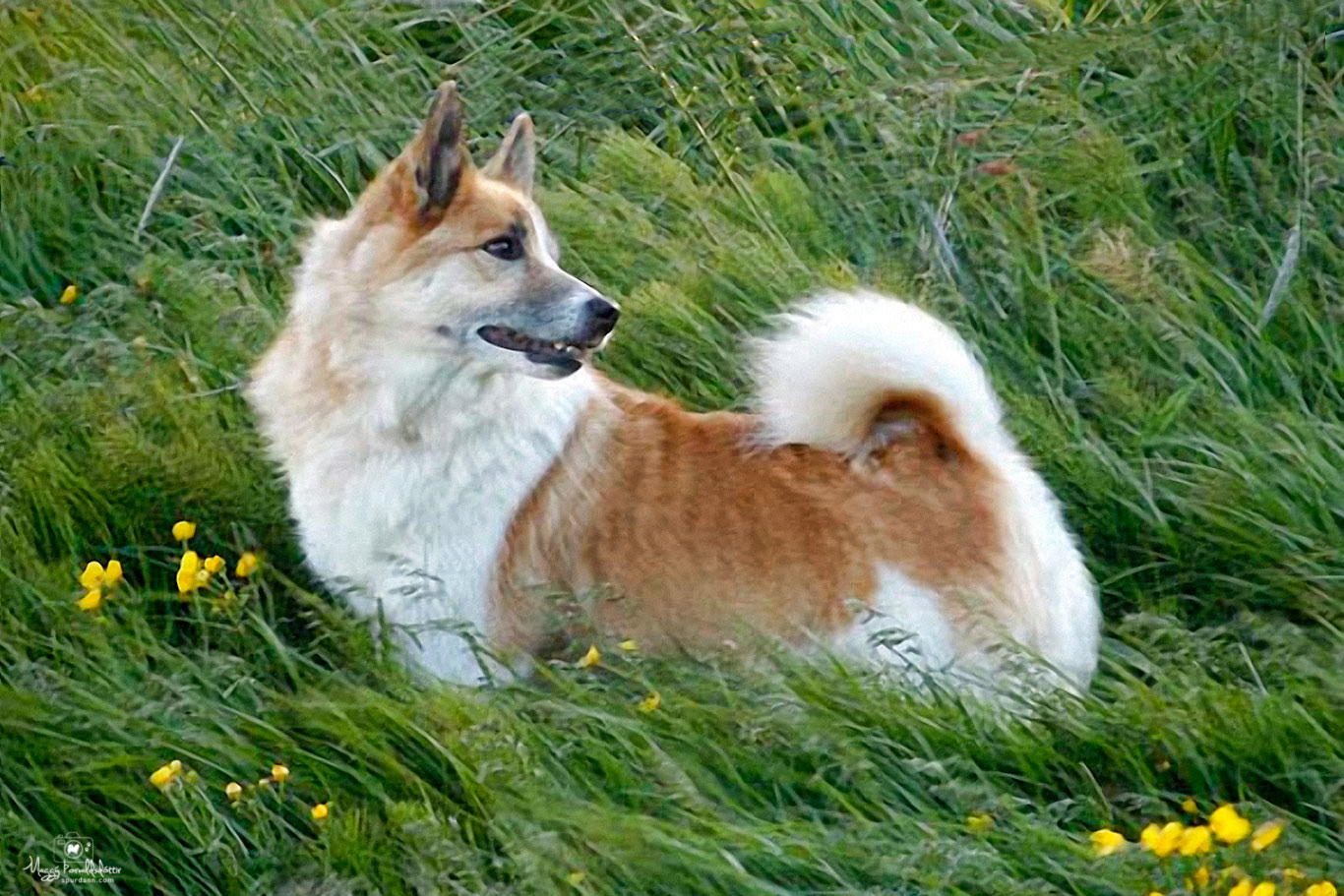 The Icelandic sheepdog is a descendant of the Nordic dogs the Vikings imported many hundreds of years ago. A hardy and agile herding Spitz that barks, slightly under medium size with prick ears and a curled tail. They're often used as working farm dogs, to help herd sheep and horses since they have a natural instinct for herding. Being very alert, they will give visitors an enthusiastic welcome without aggression. They are cheerful, friendly, inquisitive, playful and unafraid.